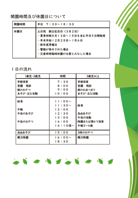 内容:各日とも在園の子ども達のクラスに入って在園児と一緒に保育参加 施設見学 子育て相談