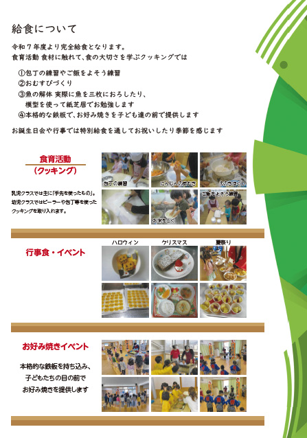 ※当園は完全給食となっておりますが、重度のアレルギー(調味料が使用できない、別調理が必要等)または宗教上の対応はできませんので、ご入園された場合、お弁当をご持参いただくことになります。